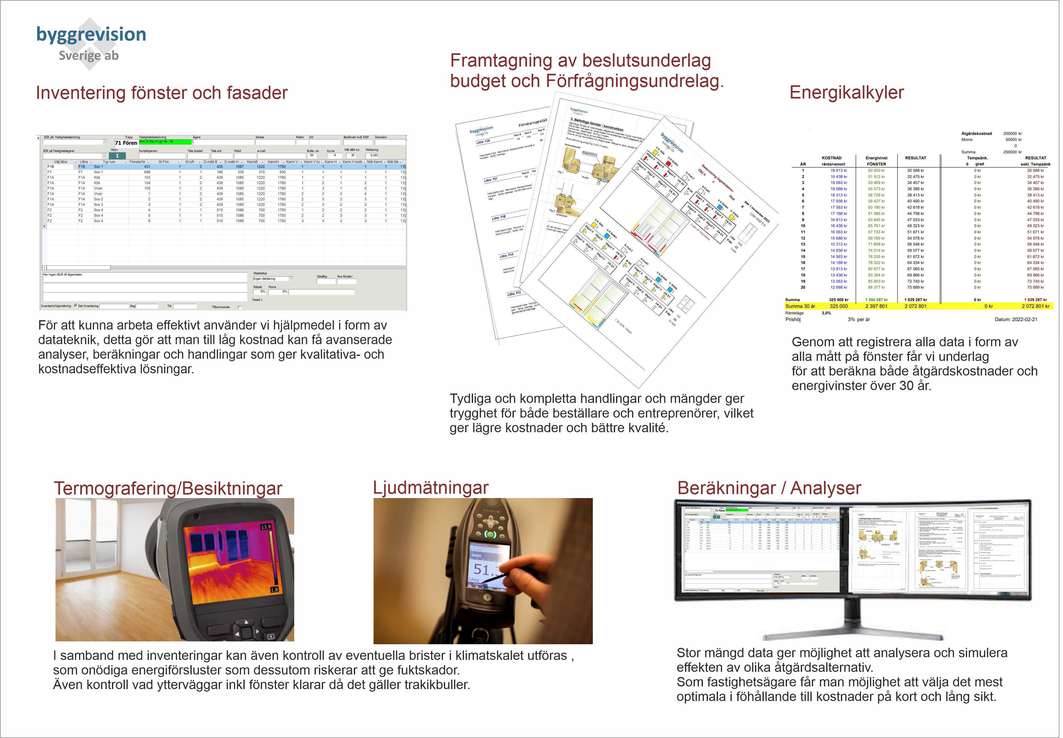 Med dessa data får vi alla mängder för att beräkna kostnader för byte till energiglas, slipning och målning av alla ytor på bågar och karmar både ut- och invändigt på fönster. Vi ritar itar även upp fönsterprofiler för att ge möjliget att bedöma