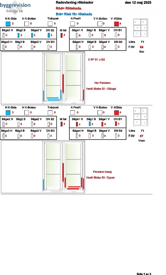Dessa dokument visar förekommande rötskador i varje fönster i lägenheten.